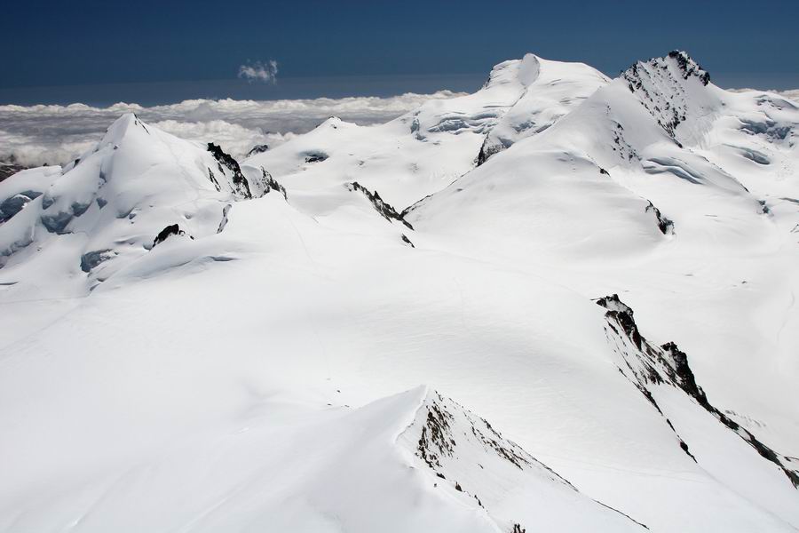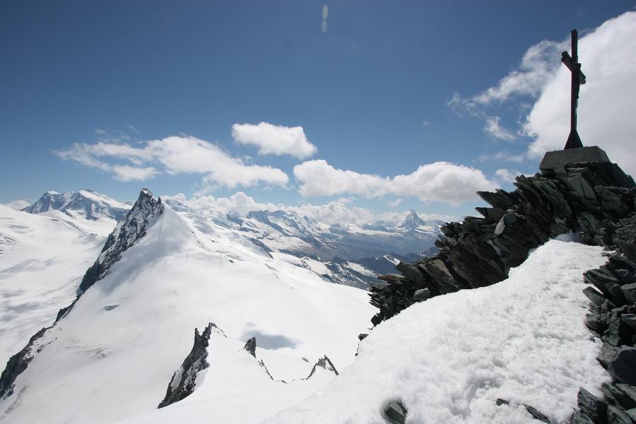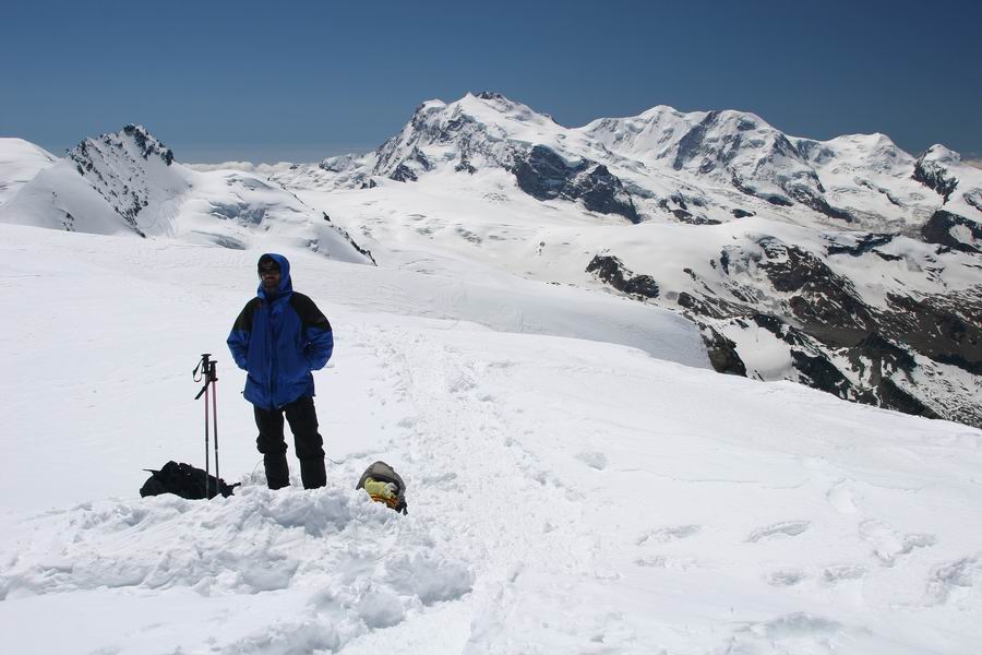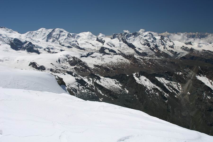 12-na vrcholu Alphubelu, vzadu skupina Monte Rosa (uprostred Dufourspitze 4634m, vpravo od nej Liskamm 4479m).jpg
